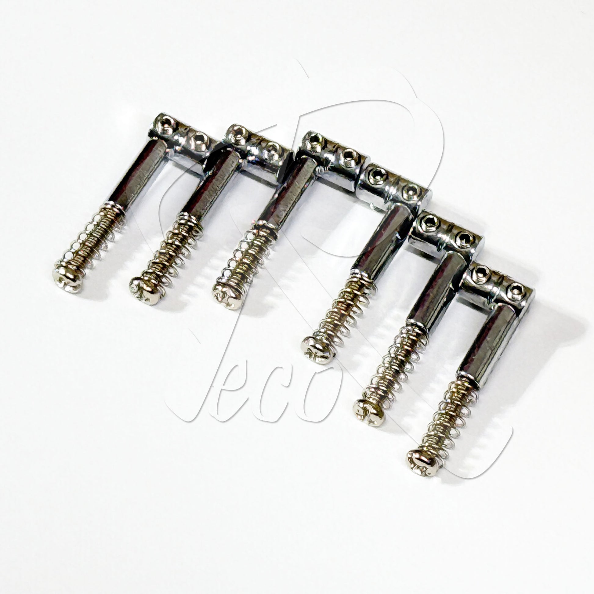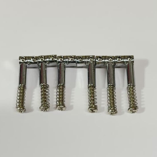 Upgrade your guitar's tone and sustain with these high-quality L-shaped bridge saddles. This set of six chrome saddles (three left, three right) is designed for guitars with 2-1/8" string spacing. Made from durable material and including necessary hardware, they ensure precise intonation and string spacing for optimal playability. Perfect for replacing worn-out or damaged saddles, these Allparts BP-2315 saddles will help you get the best sound from your instrument.