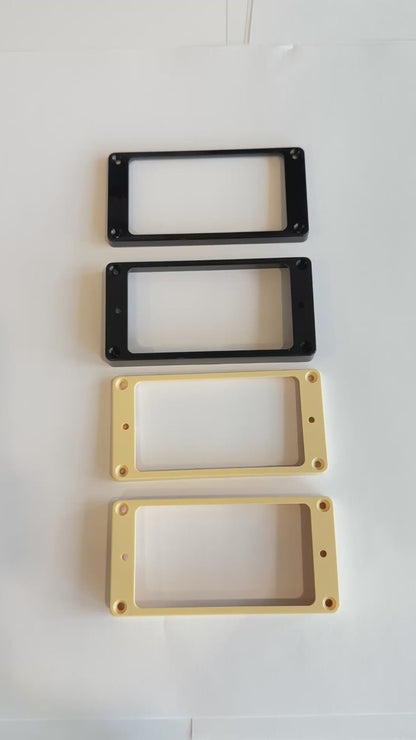 Upgrade your guitar with the Allparts PC-0743 Slanted Humbucking Pickup Ring Set, designed for a perfect fit on flat-top guitars. This high-quality set includes one short neck ring and one tall bridge ring, both with flat bottoms and slanted sides to align pickups with your strings for optimal tone and aesthetics. Crafted from durable plastic, these rings are compatible with most standard humbucker pickups, making them a must-have for guitarists, luthiers, and builders. Easy to install with matching screws (sold separately), they ensure a seamless, professional look for your instrument.