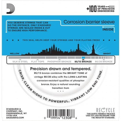 D'Addario EZ910 85/15 Bronze combines the brilliance of 80/20 bronze with the longer life characteristics of Phosphor Bronze. The EZ910 85/15 Bronze wrap wire is precision wound onto a carefully drawn, hexagonally shaped high carbon steel core, resulting in a long-lasting, bright-sounding tone with excellent intonation.