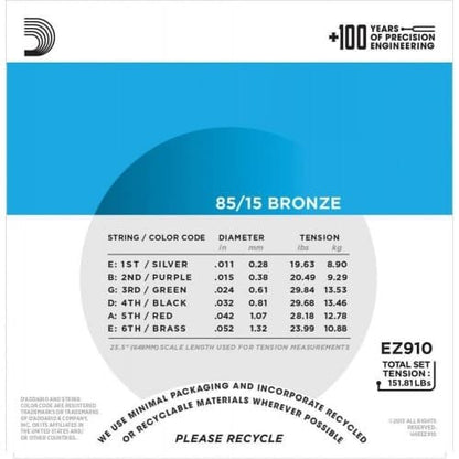 D'Addario EZ910 85/15 Bronze Acoustic Strings, 011-052