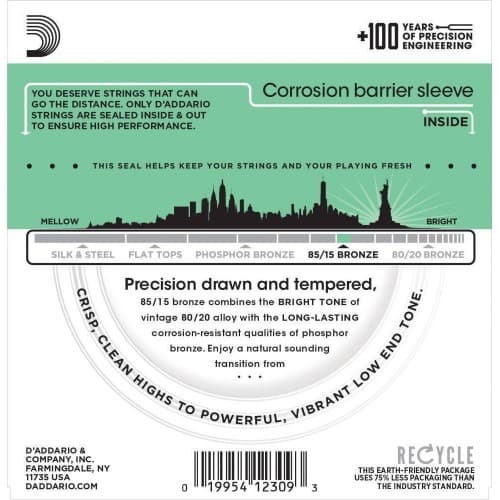 85/15 Bronze combines the brilliance of 80/20 bronze with the longer life characteristics of Phosphor Bronze. The EZ920 85/15 Bronze wrap wire is precision wound onto a carefully drawn, hexagonally shaped high carbon steel core, resulting in a long-lasting, bright-sounding tone with excellent intonation.