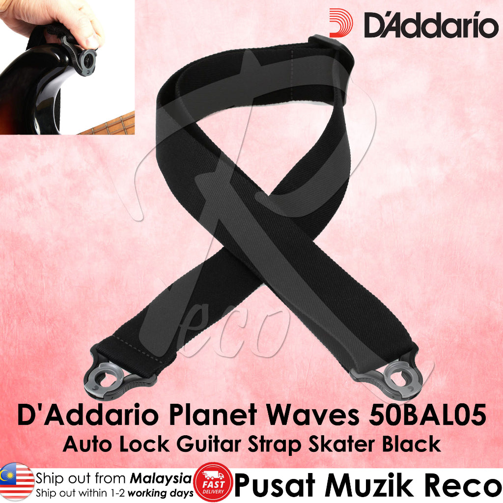 The D'Addario Planet Waves 50BAL05 50mm Auto Lock Guitar Strap in Skater Black is a high-quality guitar strap designed to provide security and comfort for guitarists of all levels. The strap features an innovative auto-locking system that provides a secure fit without the need for traditional strap locks or fasteners.