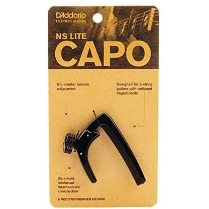 Theย D'Addario PW-CP-07 NS Capo Lite is made from lightweight, high-strength ABS thermoplastic, and solves the string buzzing, and out-of-tune performances that many guitarists face when working with a capo. This NS Capo Lite employs an ultra-light design so you can quickly and accurately position it on your guitar's neck. Its smooth, tactile dial applies even pressure for buzz-free, in-tune performances at every fret. Designed for both 6-string guitars, you'll have great control and ease of use with this D'Addario NS Capo Lite.