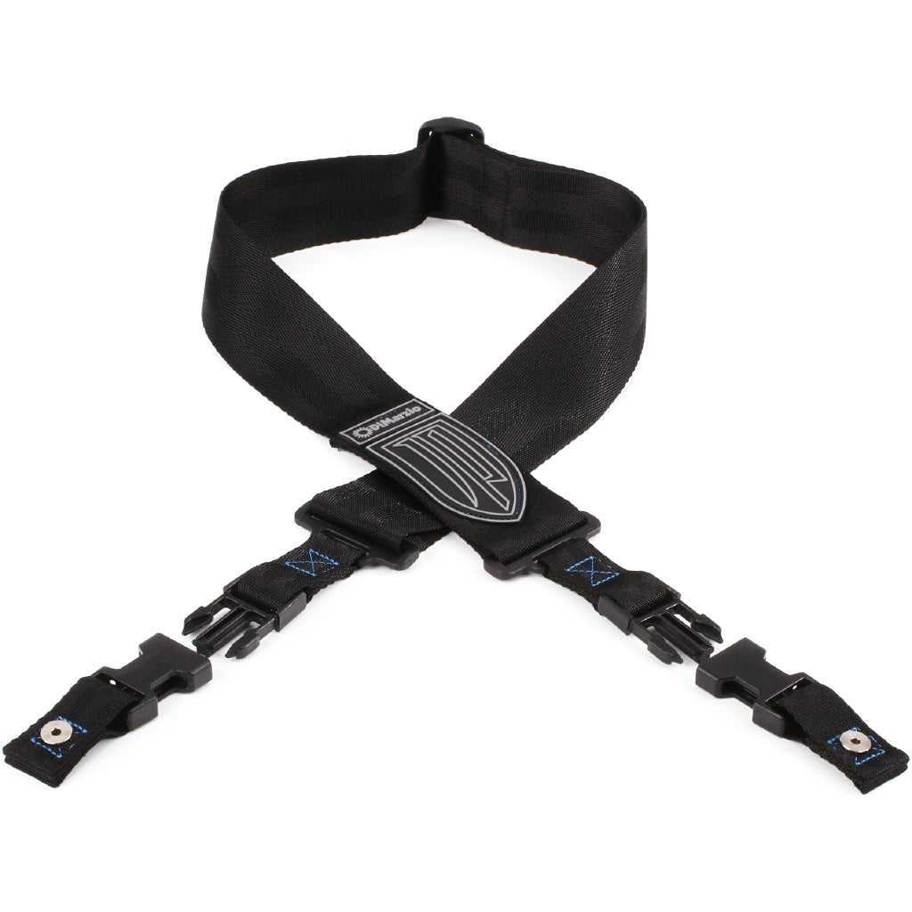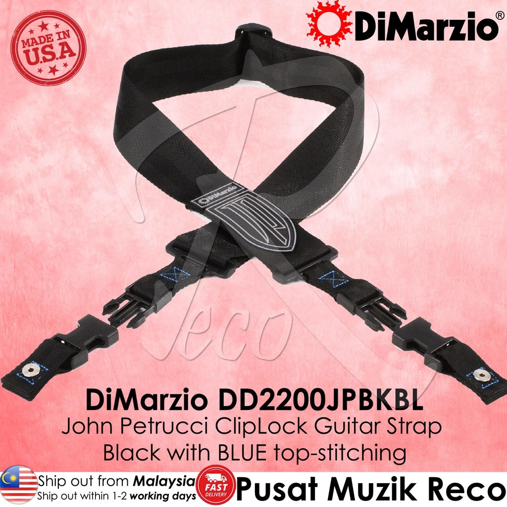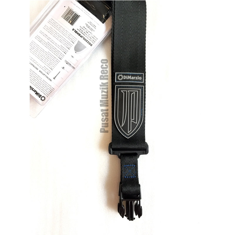 DiMarzio DD2200JPBKBL John Petrucci strap was specially designed for and with John, made to his custom specifications. It is 2"es wide and features John's JP shield logo on black nylon in gray and black stitched to the lower front portion, just above the heavy-duty clip and bushing that attaches to your guitar.