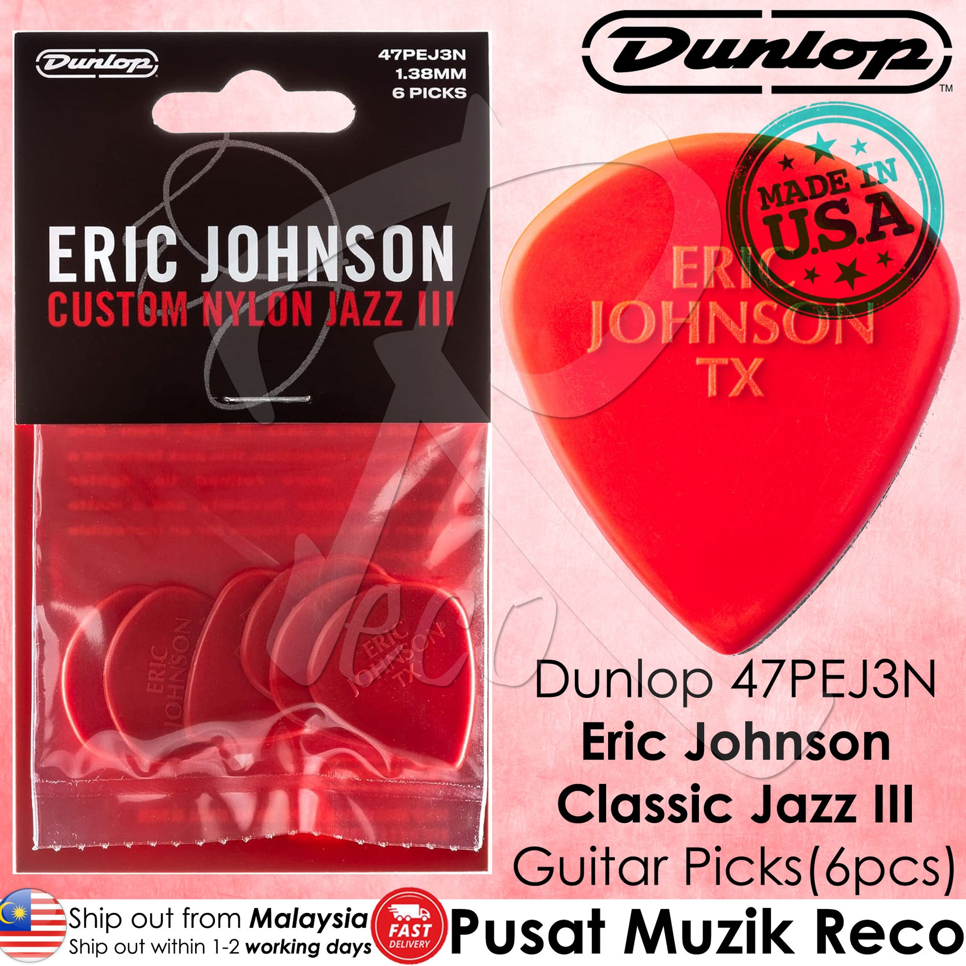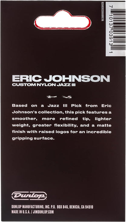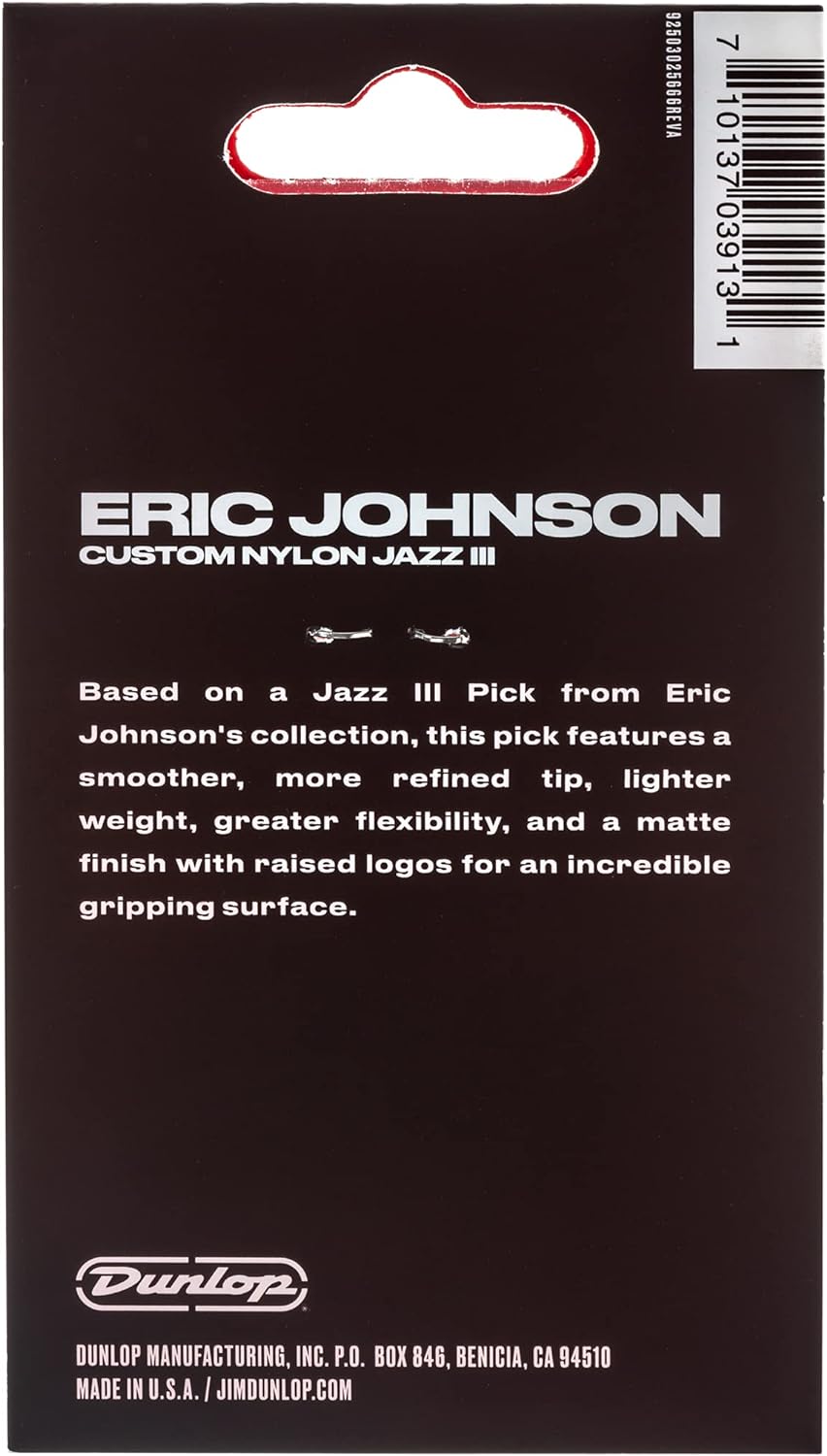 To create the Eric Johnson Jazz III Pick, Jim Dunlop laser-scanned a vintage Jazz III from Eric's collection and recreated it with the most advanced molding techniques available. The result is a Jazz III with a more refined and smooth tip, more flexibility, and a matte finish with raised logos for an incredible gripping surface. Eric Johnson Signature Jazz III Guitar Picks Modelled after a vintage Jazz III from Eric's collection Jazz III with a more refined and smooth tip, more flexibility, and a matte finish with raised logos for an incredible gripping surface