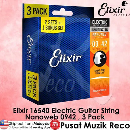 Elixir Strings 16540 Nanoweb Coated Electric Nickel Plated Steel Guitar String Super Light 0942 3 Pack