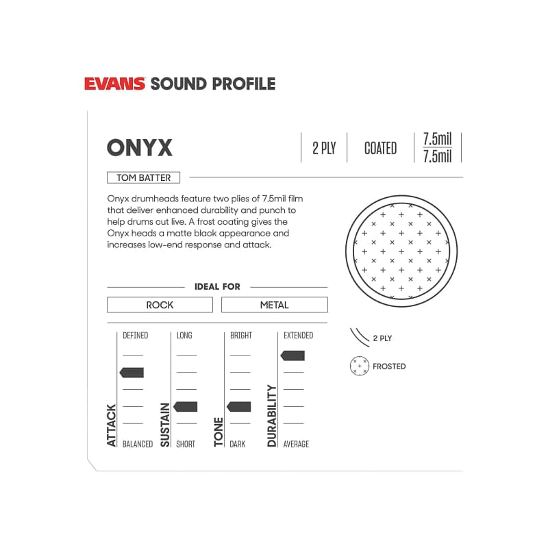 The Evans Onyx snare/tom drumhead combines two 7.5mil plies of black film that give you amazing durability while punching your drums through the mix in live performance. A frost coating gives Onyx heads a matte black appearance and increases attack and low-end response. Evans has been in the music industry for over 40 years. They pioneered the plastic drum head in 1956, changing the drum world forever. Evans' state-of-the-art manufacturing facilities in Farmingdale, NY produces heads that are unparalleled in consistency, durability, and sound quality. Want punch? You can't go wrong with Evans Onyx.