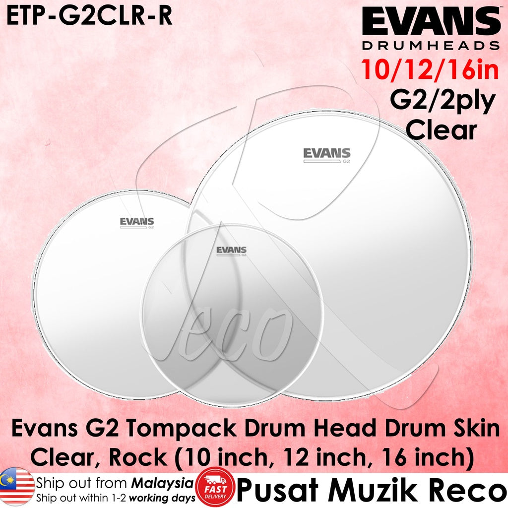 The Evans ETP-G2CLR-R G2 Clear Tom Drumhead (Rock Pack) is a set of three drumheads designed for rock drumming. The set includes three sizes: 10", 12", and 16", all of which are batter heads.