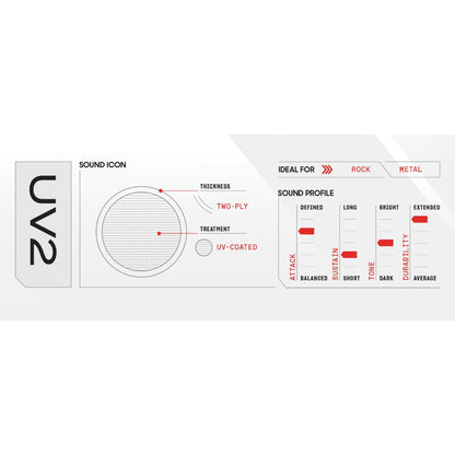 UV2 drumheads feature Evans’ patented UV-cured coating technology over two plies of reinforced 7mil film. Extensively tested with some of the heaviest of hitters, these heads set a new standard for durability in one of the most tried and true two-ply forms. They make for a versatile snare head or a warm, focused tom head with lots of attacks.