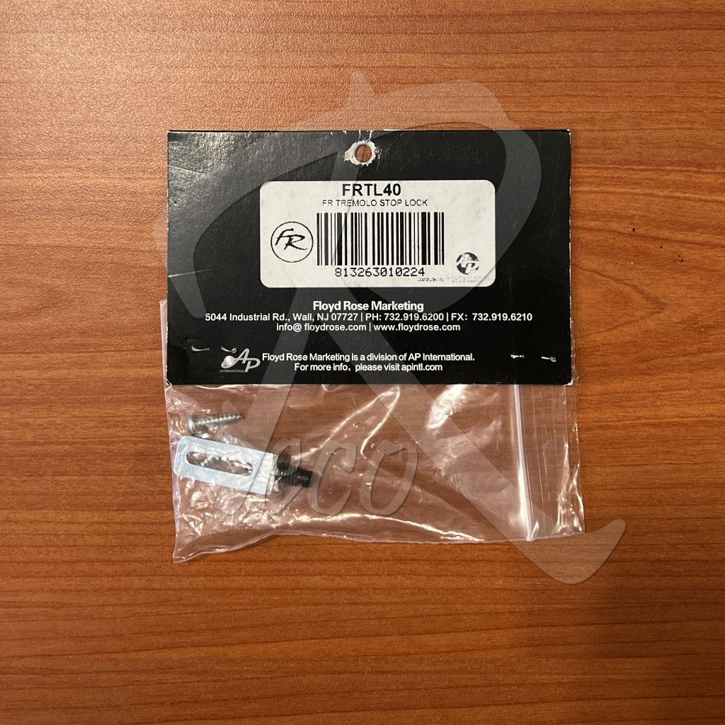 The Floyd Rose Original Tremolo Lock Stop is installed in the tremolo spring cavity and has an adjustable screw that rests against the tremolo block. The lock stops the tremolo from being pulled up, allowing dive only movement, this ensures the tremolo always returns to the same position after bending, stabilising the tuning, and stops the guitar going out of tune if a string breaks. Please note the Lock Stop is made for Floyd Rose by Pro Rock Gear and comes in their packaging.