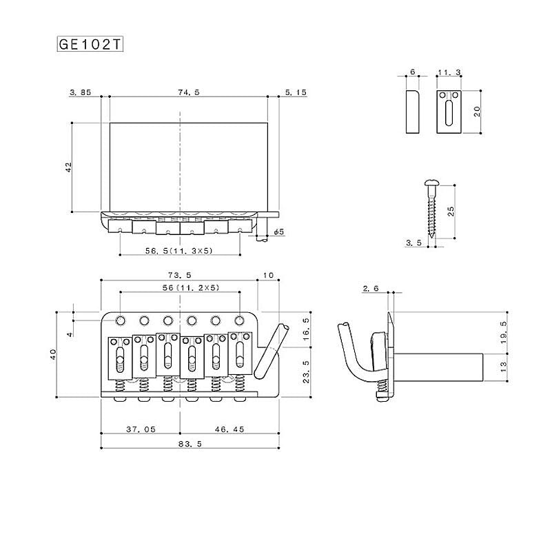 Includes mounting screws, five tension springs, spring mounting claw, .050" Allen adjustment wrench, and removable 10-32 thread tremolo arm with a plastic knob.
