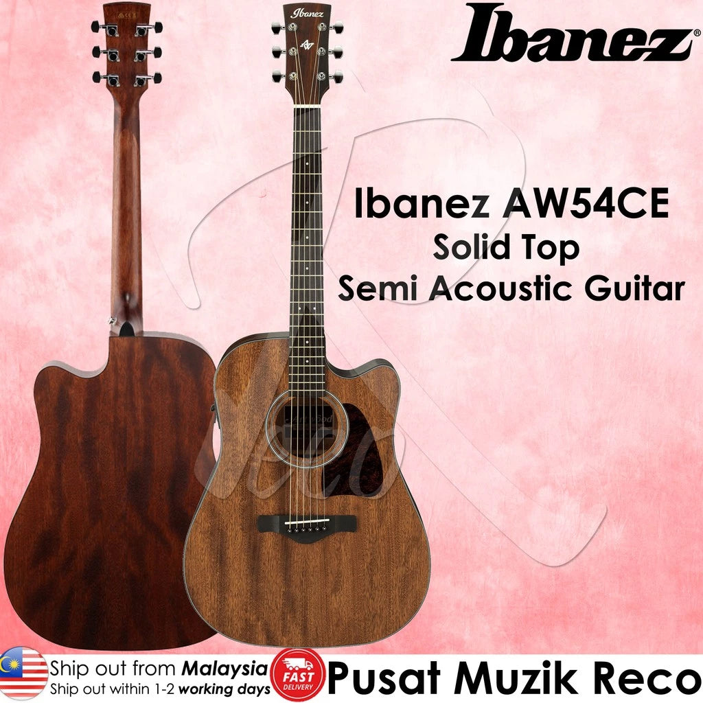 The Ibanez Artwood AW54CE acoustic-electric guitar hits all the right notes. Acoustically, the AW54CE delivers a big dreadnought tone that's nicely balanced by the internal X bracing. The solid okume construction gives you a great-looking instrument with a big, balanced sound that's ideal whether you're strumming or fingerpicking. With a Fishman under-saddle pickup and an Ibanez AEQ210TF preamp, you get natural-sounding amplification that's plug-n-play simple. You even get an onboard tuner.