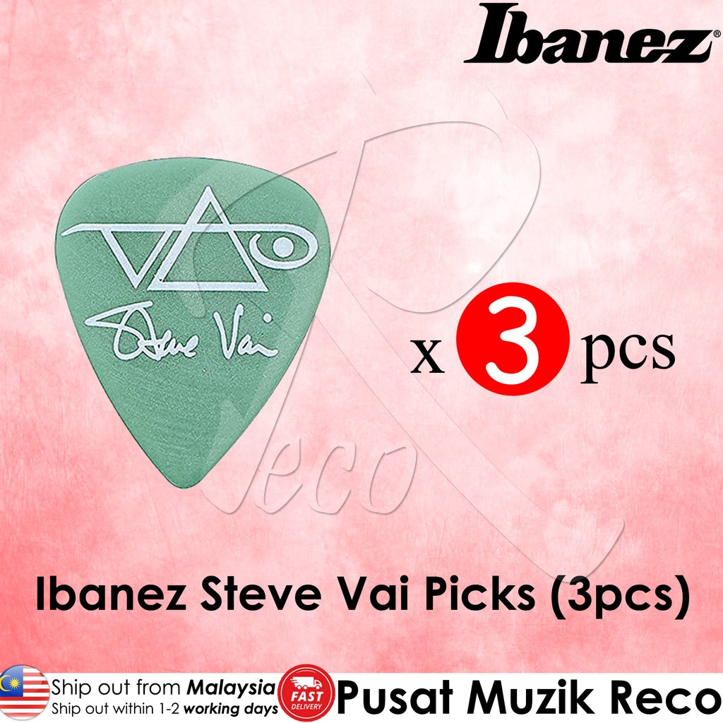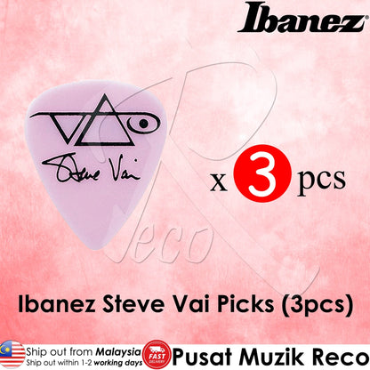 Ibanez Steve Vai's signature picks are made of polyacetal in the classic teardrop shape for enhanced attack. They come in packs of 4, featuring the pyramid motif "VAI" logo and Steve Vai's signature.