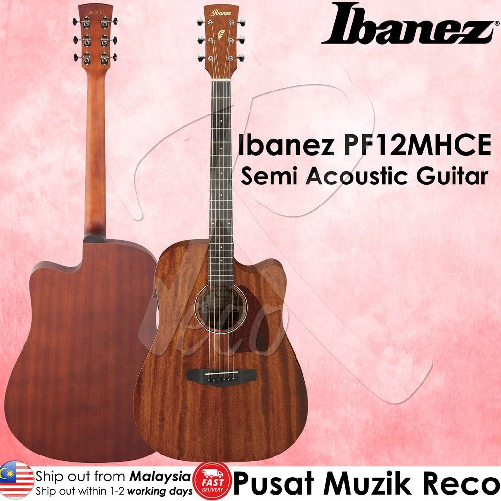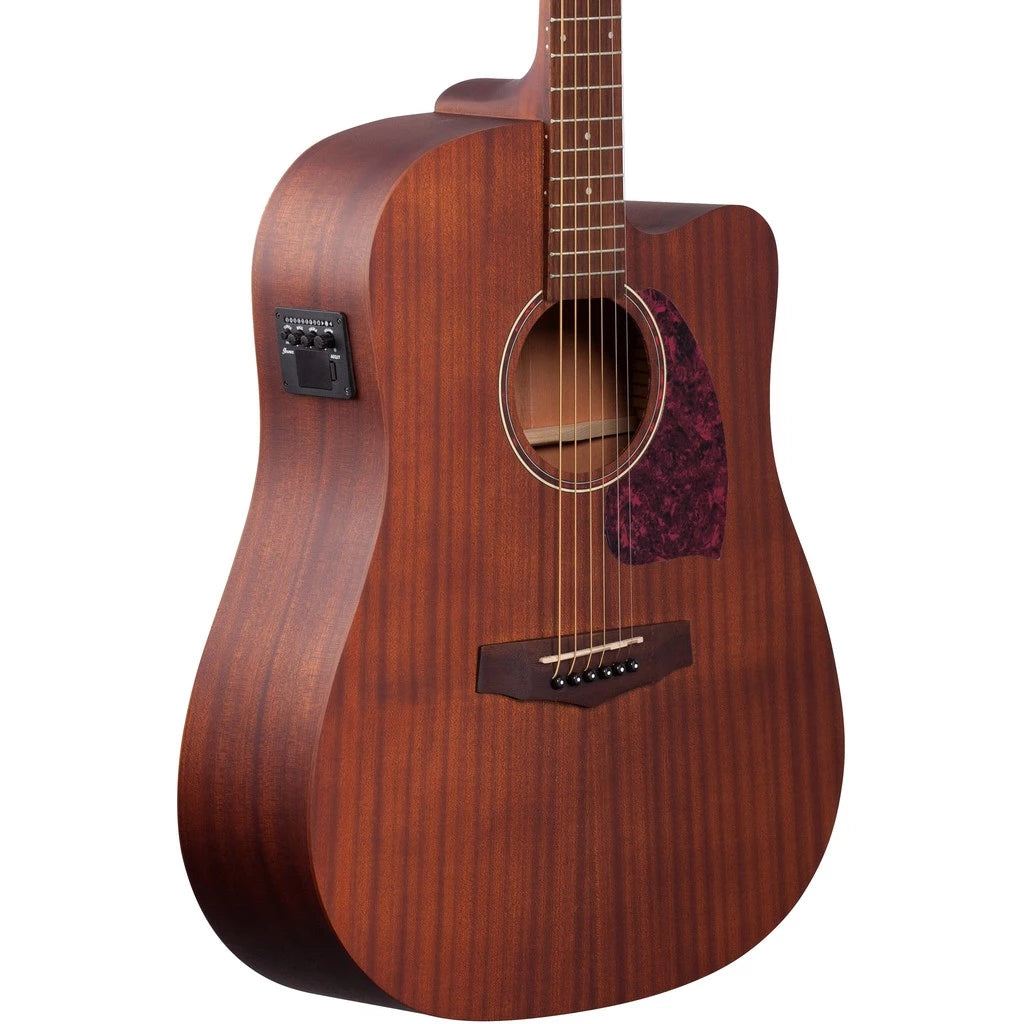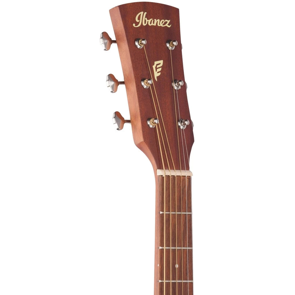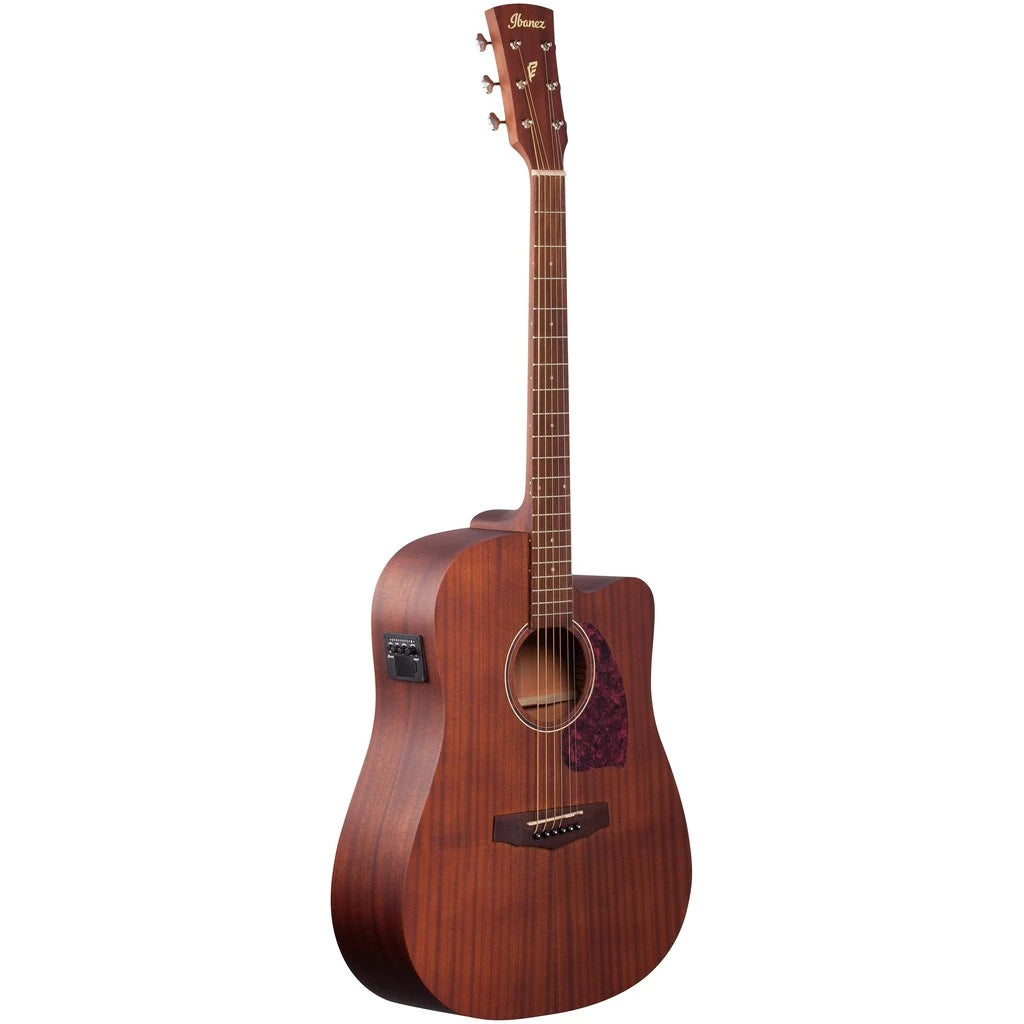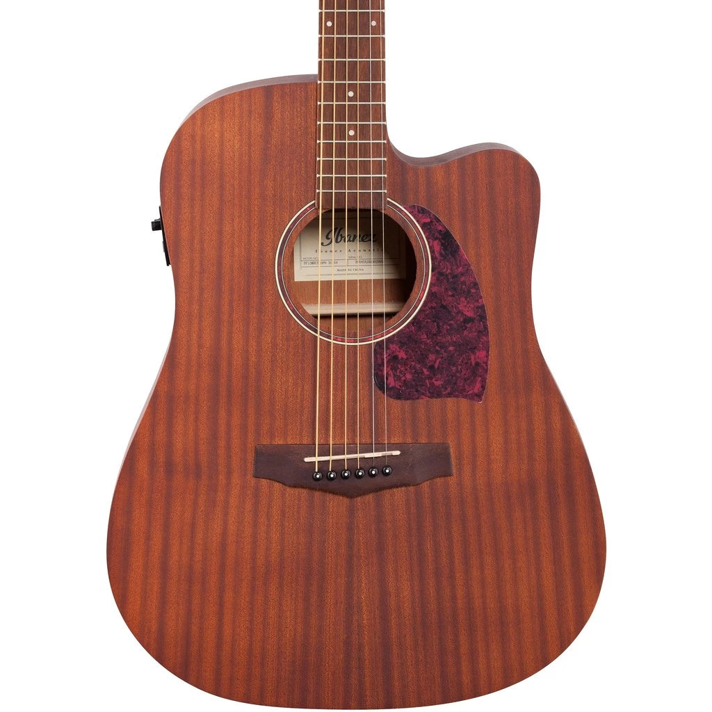The PF12MHCE is a cutaway dreadnought body style acoustic with a mahogany top, back, and sides for a warm, full tone. While the open pore natural finish adds to the guitar's natural, subtle aesthetics, it also contributes to the sound of the instrument. Electronics include the Ibanez under-saddle pickup and the Ibanez AEQ2T preamp with a built-in tuner. The PF12MHCE also features a tortoise rosette, rosewood fretboard, and a bridge with Ibanez Advantage bridge pins for improved tuning stability.