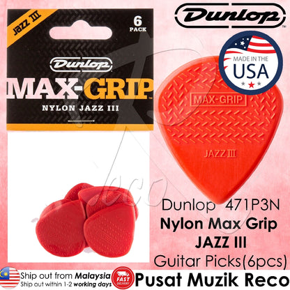 Jim Dunlop 471P3N Red Nylon Max Grip Jazz III 1.38mm Guitar Picks Player Pack