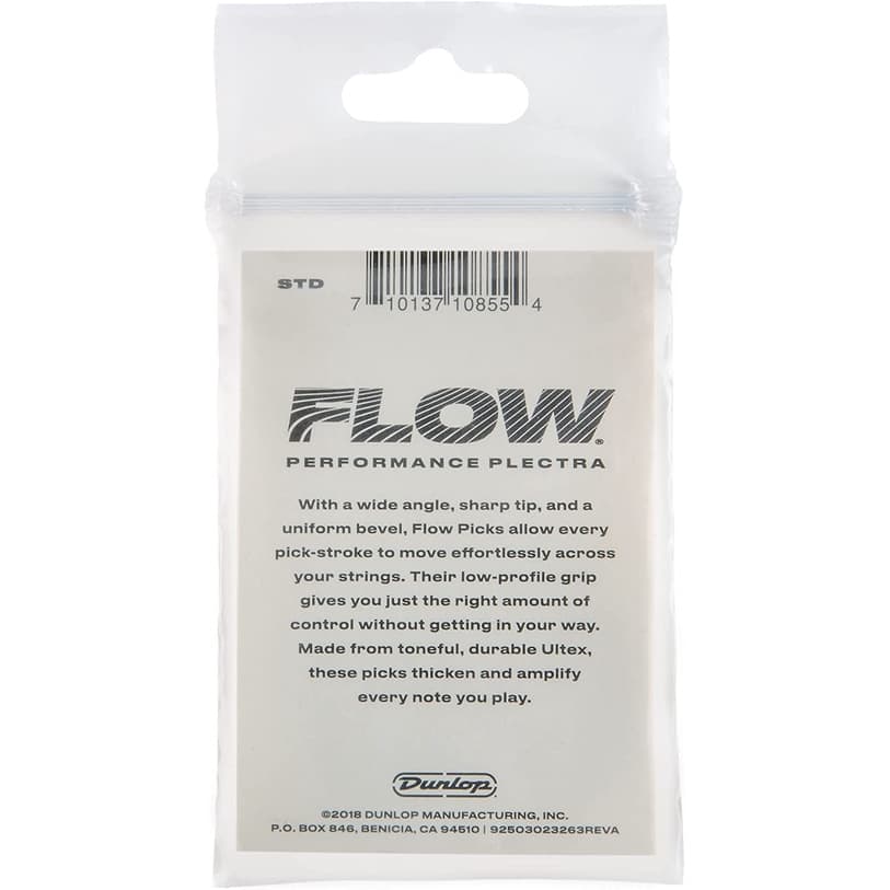 Jim Dunlop Flow Picks add thickness and volume to each note you play while allowing every pick-stroke to fall smoothly and effortlessly from your strings thanks to bright, durable Ultexยฎ material, a wide-angle and sharp tip to focus your attack, a uniform bevel that reduces string drag, and a low-profile grip just the right amount of control.
