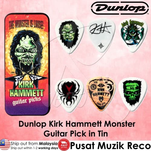 Jim Dunlop KH01T088 Kirk Hammett Monster Guitar Pick Tin features six picks: five featuring art from Dirty Donny inspired by the ax-wielding Metallica madman and one pick modeled after Kirk's signature Jazz III.