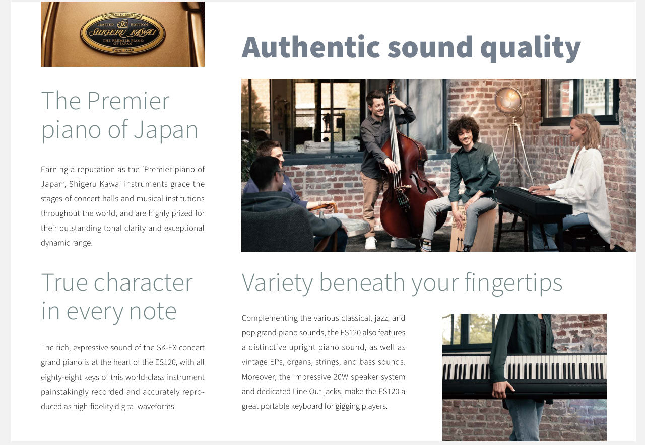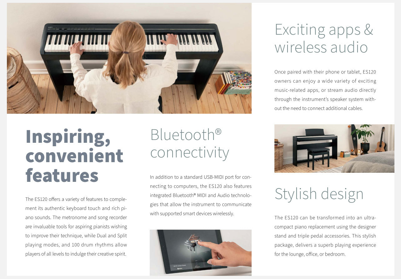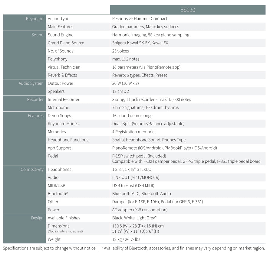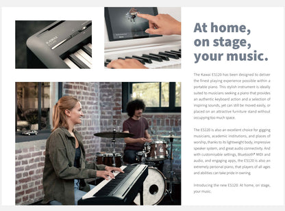 The latest addition to the highly respected ES range, the ultra-portable ES120 features an improved Responsive Hammer Compact keyboard action, beautiful Shigeru Kawai grand piano sounds, and built-in Bluetooth® MIDI and Audio connectivity, delivering gig-friendly grand piano touch and tone at a remarkably affordable price.