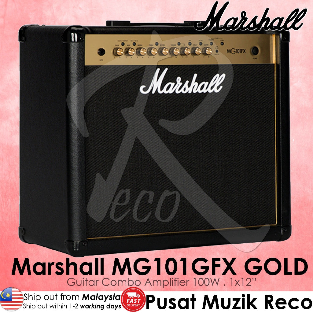 The Marshall MG101GFX is loaded with a pure Marshall tone. You get your choice of Clean, Crunch, OD1, and OD2 channels that you can shape with a 3-band EQ. You also get integrated reverb, delay, and digital effects. Best of all, each channel's settings are storable and recallable. There's enough power on tap for any venue, and the MG101GFX's revolutionary solid-state design convincingly emulates a tube amp's tone and response. Beyond that, the MG101GFX supplies you with a 2-button footswitch, switchable effects loop, built-in tuner, and a line input for music players. Emulated headphones and line outputs are also onboard. Part of Marshall's MG Gold series, the MG101GFX is great for the studio and the stage.