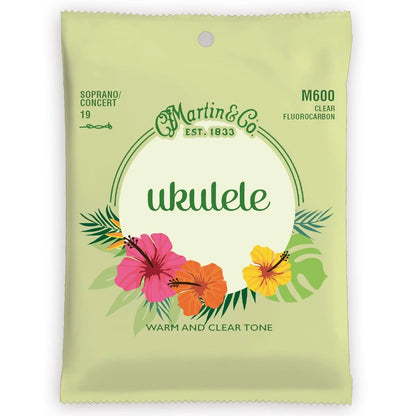 Martin M600 Clear Fluorocarbon Soprano/Concert Ukulele Guitar Strings offer a rich, amplified tone. The fluorocarbon strings allow less elongation and therefore resist tone loss from stretching due to tuned-to-pitch tension providing longer play between tunings.