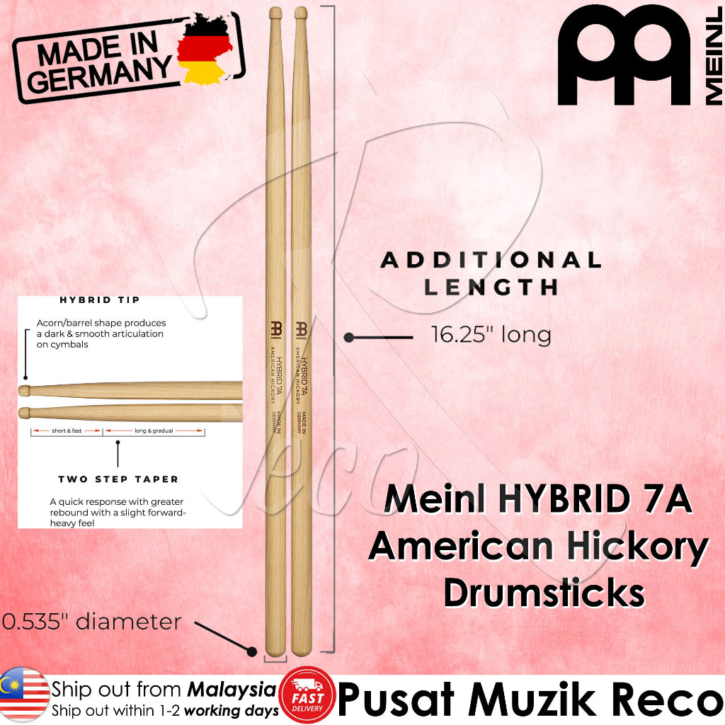 Meinl SB105 Hybrid 7A Drumstick American Hickory, Hybrid Tip