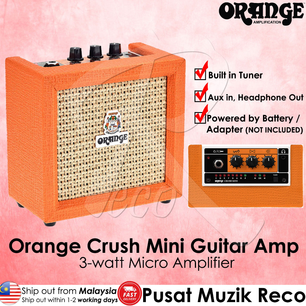 The Crush Mini feeds your Orange obsession anywhere in the world, at any time of day. This mighty 3-watter is powered by a standard 9-volt pedal power supply or 9-volt battery. So whether you're working late, warming up backstage, or jamming at home, the Orange Crush Mini is the ultimate portable solution. Simple Gain (drive), Shape (EQ), and Volume controls grow the familiar Yorkshire jangle to a raucous ruckus in seconds. And the iconic orange vinyl and woven grille are sure to warm the hearts of Orange lovers everywhere. An onboard tuner, 1/8" music input, and headphone output also make the Crush Mini a formidable practice tool as well.