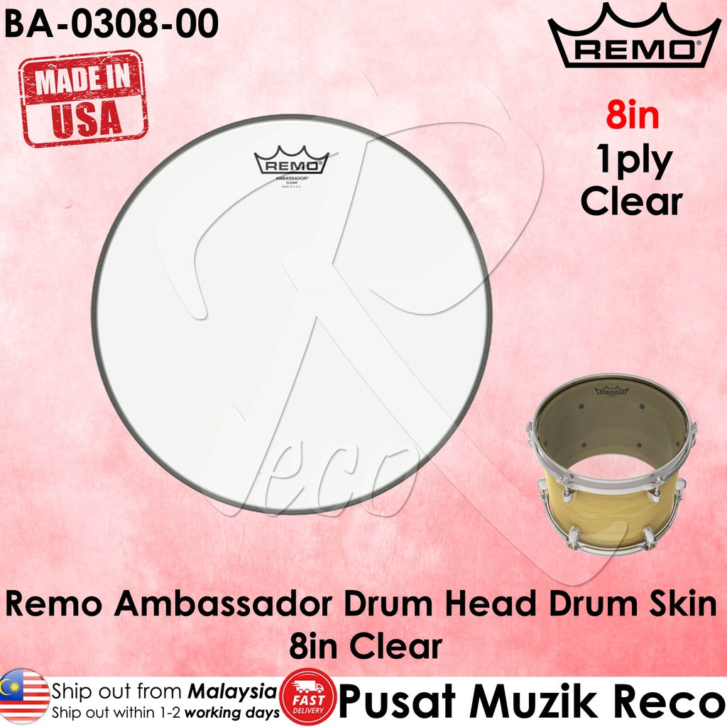 The Remo BA-0308-00 8" Clear Ambassador drum head is a medium-weight drum head made with a single-ply 10-mil Mylar film. It produces an open, bright, and resonant sound with plenty of attacks. It is suitable for use as a batter or resonant head and for most drumset and concert percussion applications.