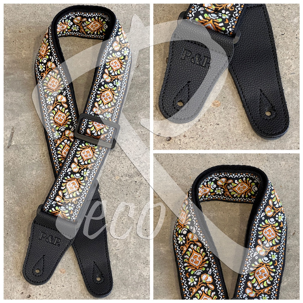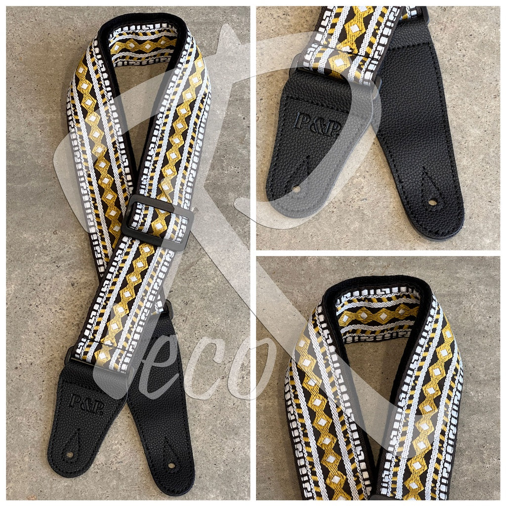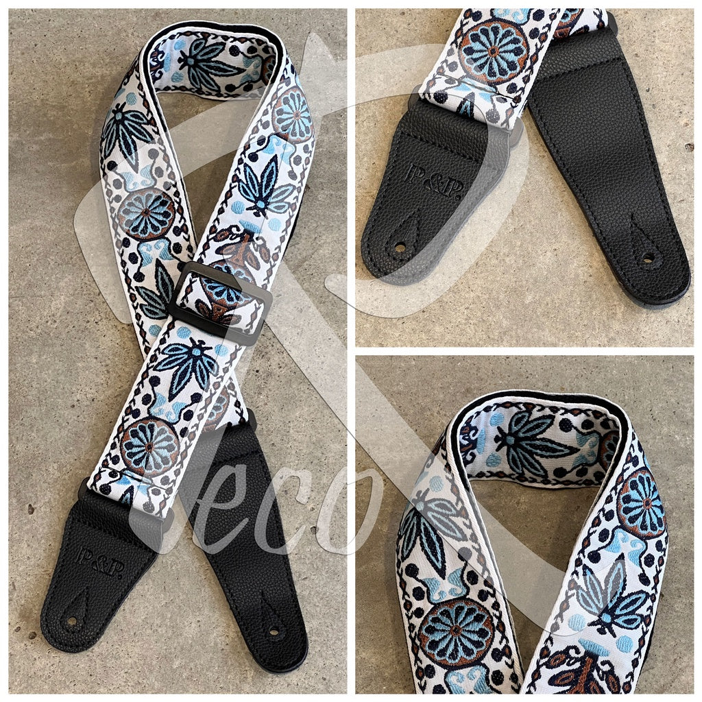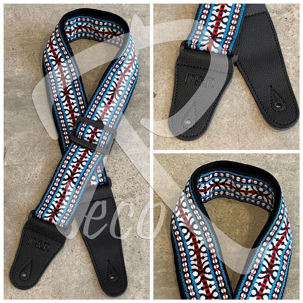 New Retro Design BRAIDED Cotton Acoustic Electric Guitar Strap This New Guitar strap by displays a beautiful pattern reminiscent of the retro of the Woodstock era, giving it that vintage hippie vibe!- Faux Leather ends.- Soft comfortable material - adjustable buckles-Adjustable length is approximately 82-137cm.