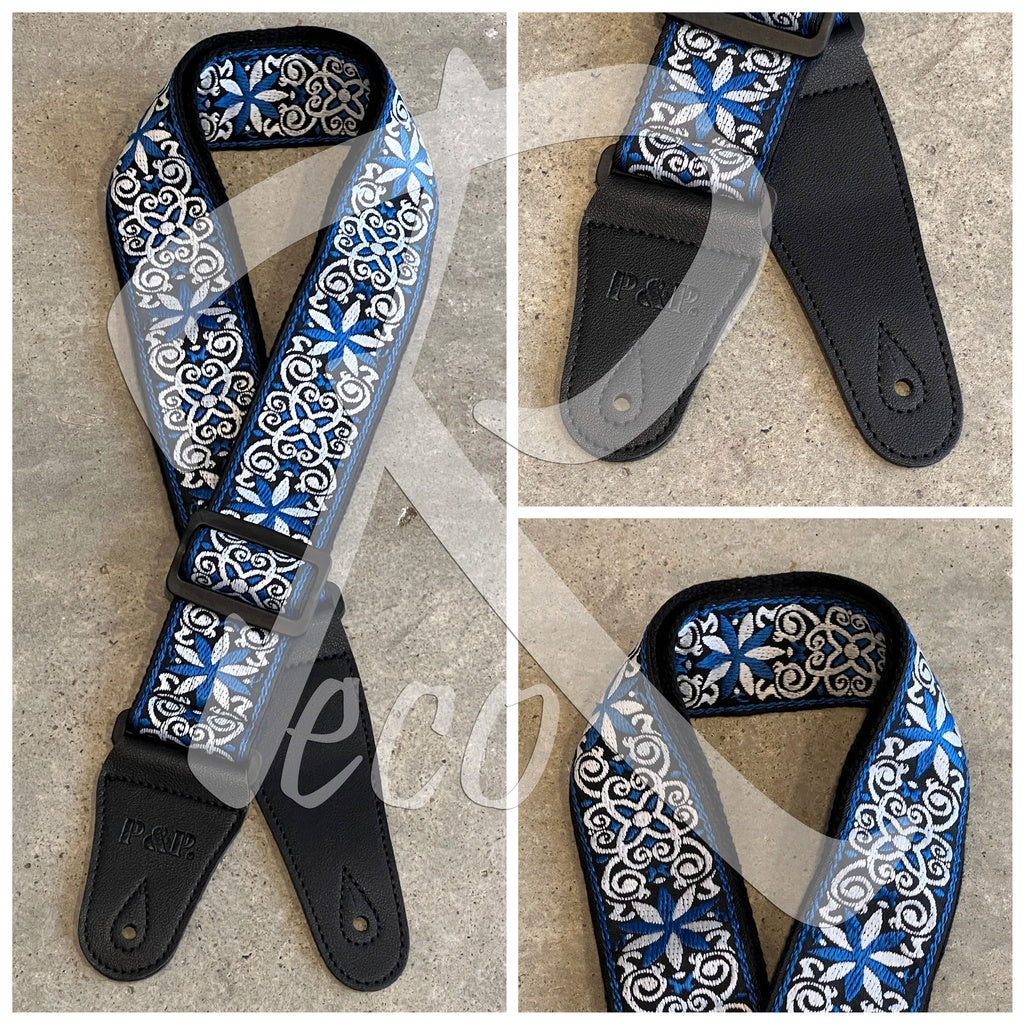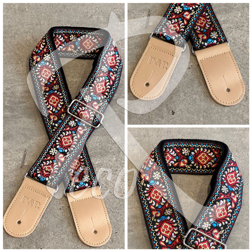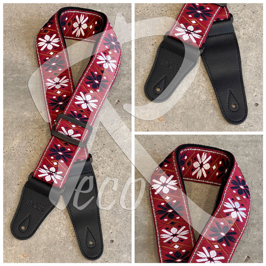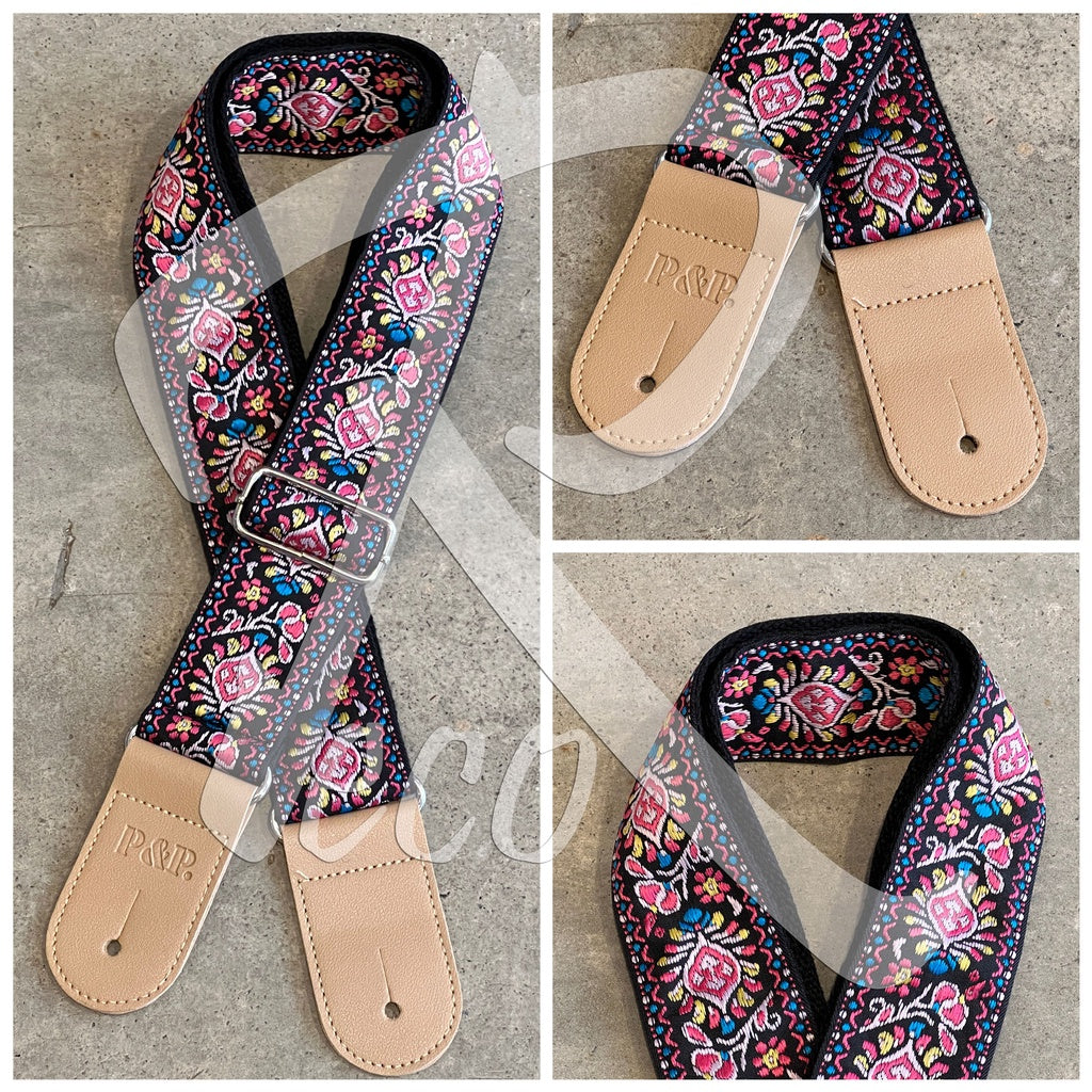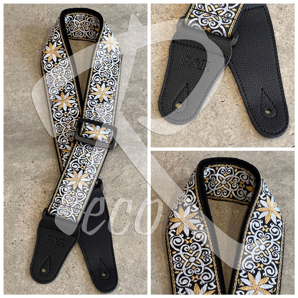 New Retro Design BRAIDED Cotton Acoustic Electric Guitar Strap This New Guitar strap by displays a beautiful pattern reminiscent of the retro of the Woodstock era, giving it that vintage hippie vibe!- Faux Leather ends.- Soft comfortable material - adjustable buckles-Adjustable length is approximately 82-137cm.