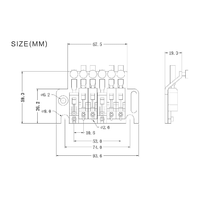 This RM Electric Guitar Floyd Rose Double Locking Tremolo Bridge System Set is perfect for any electric guitar player. With a mount size of 74MM between the 2 studs centers, a solid metal material, and a weight of 478g per set, this system provides stability and precise tuning. Package includes all necessary parts for easy installation.