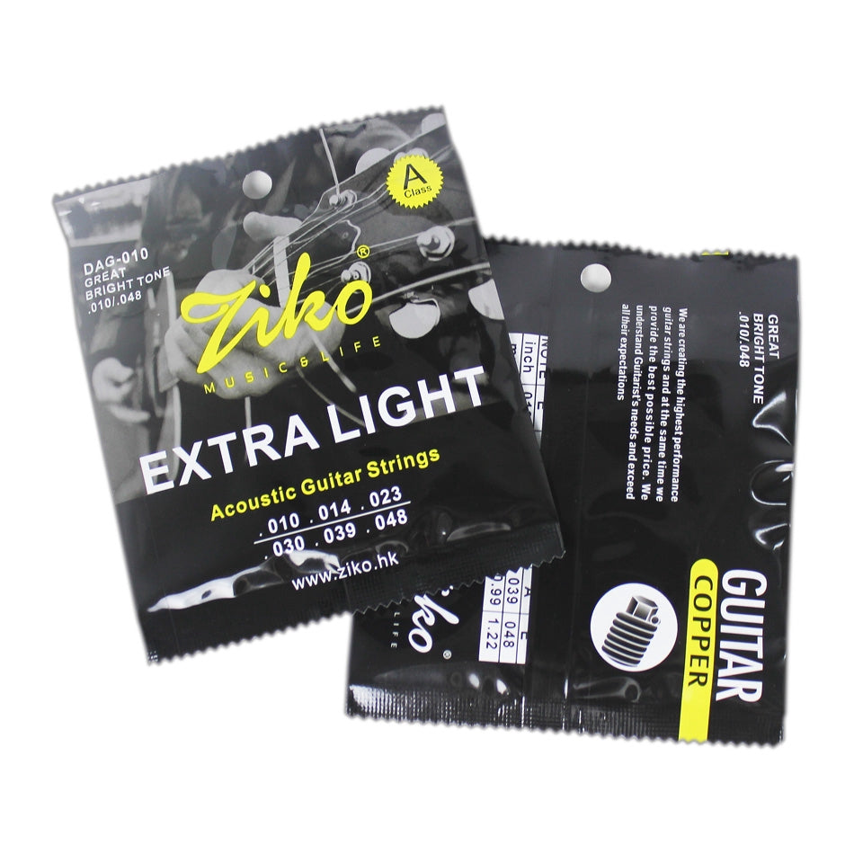 Ziko offers the highest performance guitar strings while keeping the price very reasonable. Bright tone and phosphor bronze finish allow long life and great, smooth action. High E .010, B .014, G .023, D .030, A .039 and low E .048. Excellent choice for acoustic-electric guitars as they deliver excellent magnetic output. Copper-plated steel wire is precisely wound onto a round core. Precise intonation and unparalleled consistency, set after set.